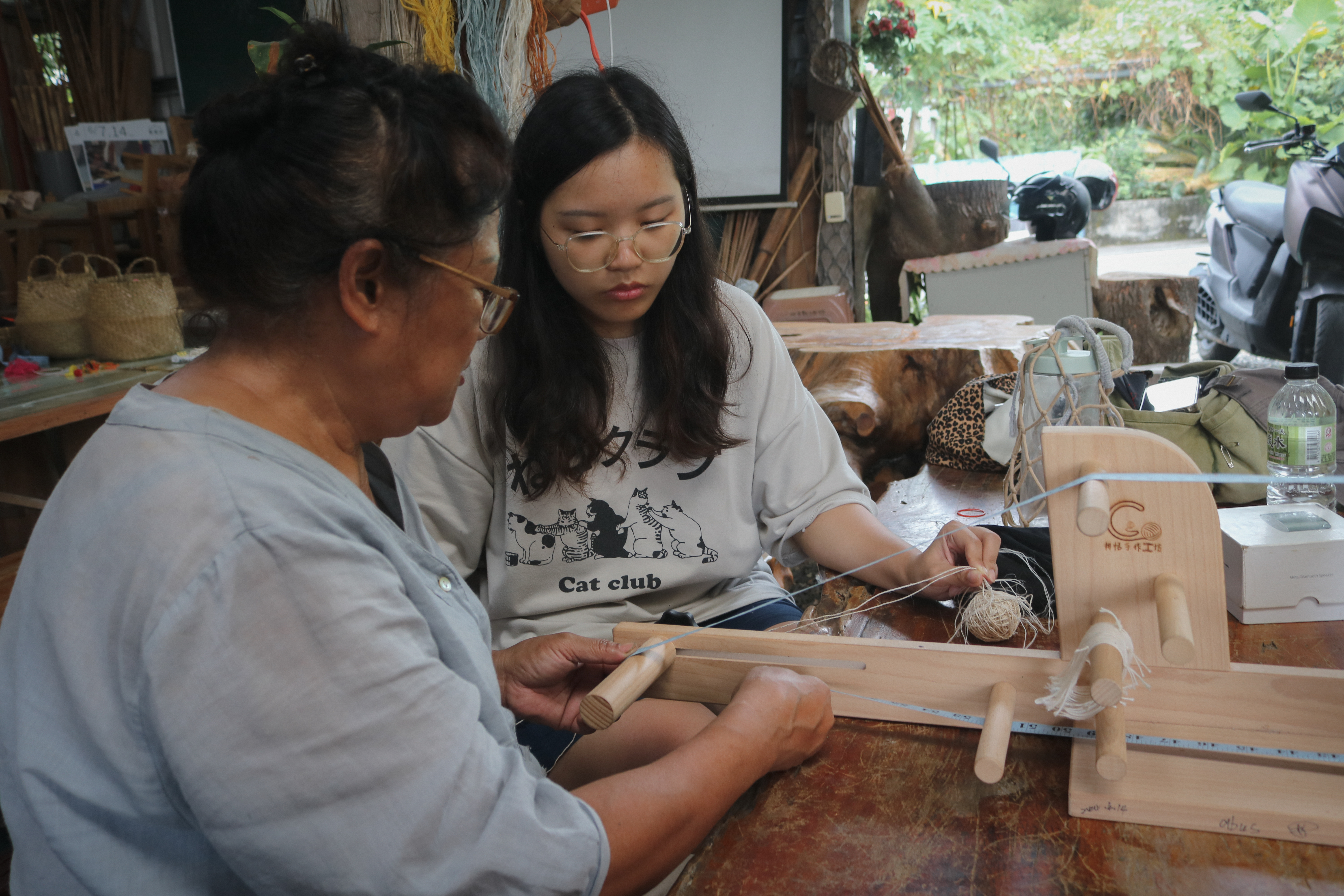 某天,一位年長的族人被她認真投入的模樣所感動,主動將自家種植的苧麻田交由她接手。從那時起,她開始負責從種植苧麻、萃取纖維、製作線材,到織布的整個工序。我們造訪那日,剛好有來此參加合宿的學生,與她一同體驗從採收苧麻到紡線的過程。這裡不只是學習織布的場域,也接納跨領域的創作合作與駐村藝術家。Abus 對研究充滿熱情,也積極參與國際交流,曾赴日本多個織品產地參訪。她說:「首先,我希望讓更多人認識我們布農族的文化;再來,我更希望祖先們留下的智慧與技藝,能世代傳承下去。」